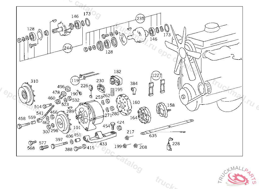 ALTERNATOR THREE-PHASE, UP TO IDENT NO. 556499 EXCEPT 543411,543418,551148,551588,551771,552021,552392,552551,552654,552687,552694,552840,552846,553000, 553005,553105,553112,553185,553210,553226,553264,553332,553602,553651,553660,553795,554081,554103, 554107,554213,554266,554270,554333,554993,555186,555885,555902,555992,556045,556120,556138,556143, 556146,556169,556181,556184,556187,556189,556194-556197,556215. PART IS ONLY OR ALSO SUPPLIED AS RECONDITIONED PART