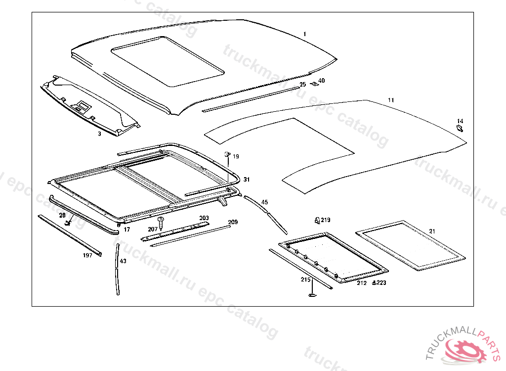 FRAME WITH HEADLINER FOR SLIDING ROOF PLATE, NEW EQUIPMENT 9/79 107.022 001021 107.023 010496 107.024 010755 EXCEPT FOR 010745-010754107.042 000843 107.043 012033 107.044 027279 EXCEPT FOR 027268,027277 FOR COLOR AND CODE NOS.,SEE PASSENGER CAR EQUIPMENT MANUL