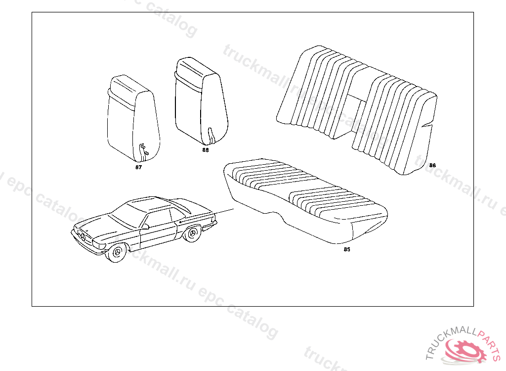 BACKREST LESS COVERING AND LESS RECLINING SEAT FITTING, UP TO CHASSIS 107.023 009197 107.024 005749 EXCEPT FOR 005731,005737-005745,005747,005748 FOR COLOR AND CODE NOS.,SEE PASSENGER CAR EQUIPMENT MANUL WHEN ORDERING,PLEASE STATE WHETHER FRONT SEAT BASKREST SHOULD BE MADE READY FOR INSTALLATION OF HEADREST