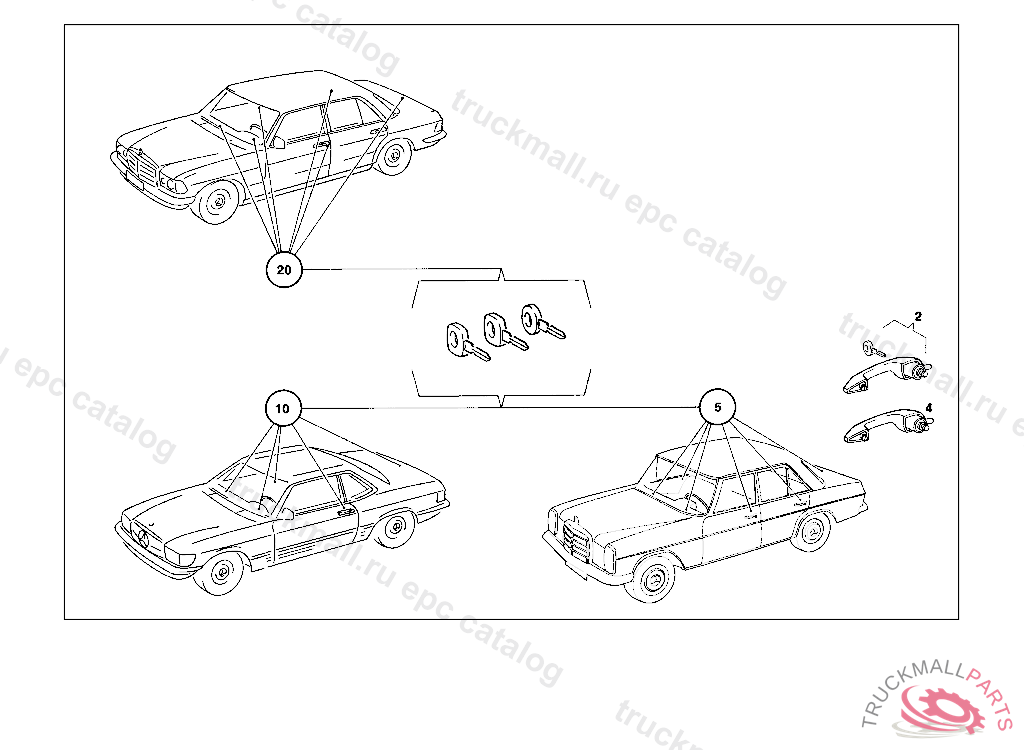 OUTFIT (LOCK,KEY,HANDLE) , FROM CHASSIS:115.055,007,008 112275 115.000.002,099406 115.100,102,103 259276 UP TO CHASSIS: 114.005 UNTIL PRODUCTION STOP 114.007,008 219625 115.000,002,100,102,103 UNTIL PRODUCTION STOP 115.005 016519 115.105,107,108 032884