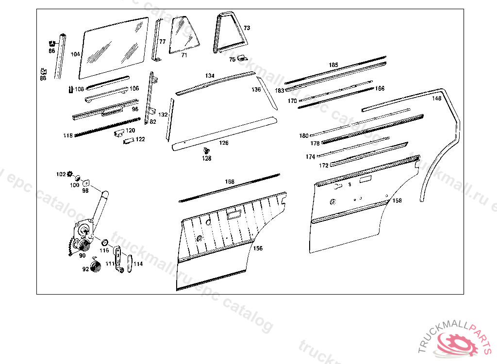 PANELLING LEFT REAR DOOR, STATE COLOR NUMBER WHEN ORDERING FROM CHASSIS: 111.010 017590-069692 UP TO CHASSIS: 110.010 130557 110.110 225647