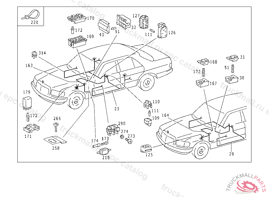 ELECTRIC CABLE FROM SWITCH CLUSTER TO FRONT AND REAR DOOR WINDOW REGULATOR MOTORS, 126.021 004409 126.022,023 015515 126.032,033 006575 126.036 005737
