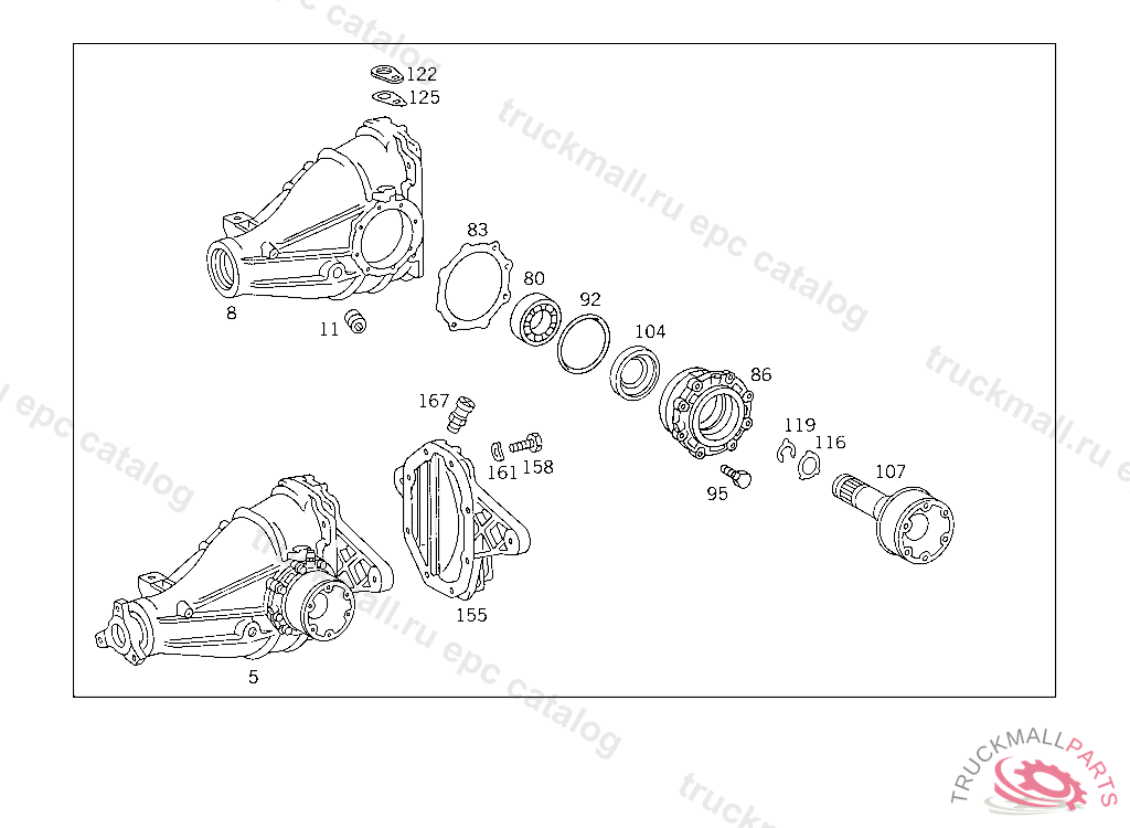 SPACER WASHER AS REQUIRED 2.8 MM, REAR AXLE HOUSING WITH DIFFERENTIAL AND WITH SIDE BEARING CAPS 003 103238 007 087550 086 007105 093 008991 102,103 240182 105 231728 183 015394 190 021956 193 002092 200 027294 280 000776 283 003631