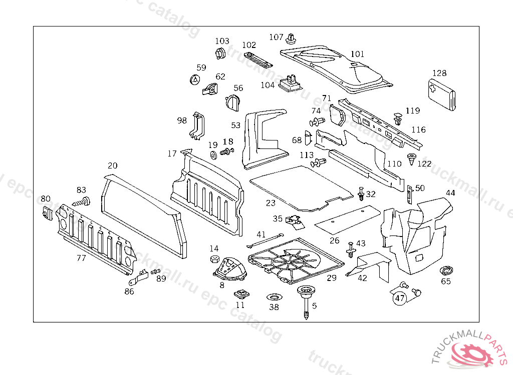LINING REAR BODY PANEL,BOTTOM, FROM CHASSIS NEW EQUIPMENT 6/91 F 038363NO.9A76I NO.5A91I NO.8E54I NO.8F22I NO.8F34I NO.6B45I NO.3B24I NO.7C21I IIIIIIII F 125157 EXCEPT CODE 806 ALSO INSTALLED IN VEHICLE FROM F 125158 WITH CODE 805