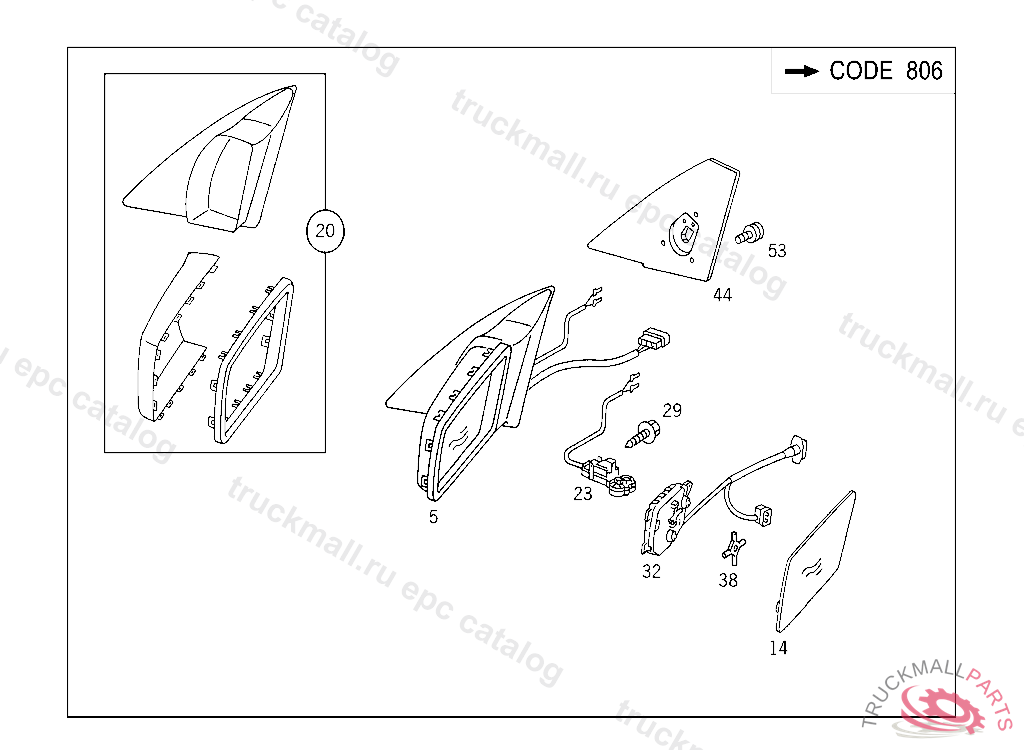 MIRROR GLASS CONVEX, RIGHT, F 140421 EXCEPT CODE 807 ALSO INSTALLED IN VEHICLE FROM F 140422 WITH CODE 806