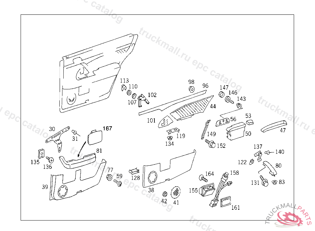 PANELLING RIGHT REAR DOOR,CENTRAL, USED WITH FABRIC TRIM, A 192209 ALSO INSTALLED ON A 159651 - A 192207 WITH CODE 856NO.9A93I NO.5B06I .......I .......I NO.8F27I ........ I .......I NO.7C39I I