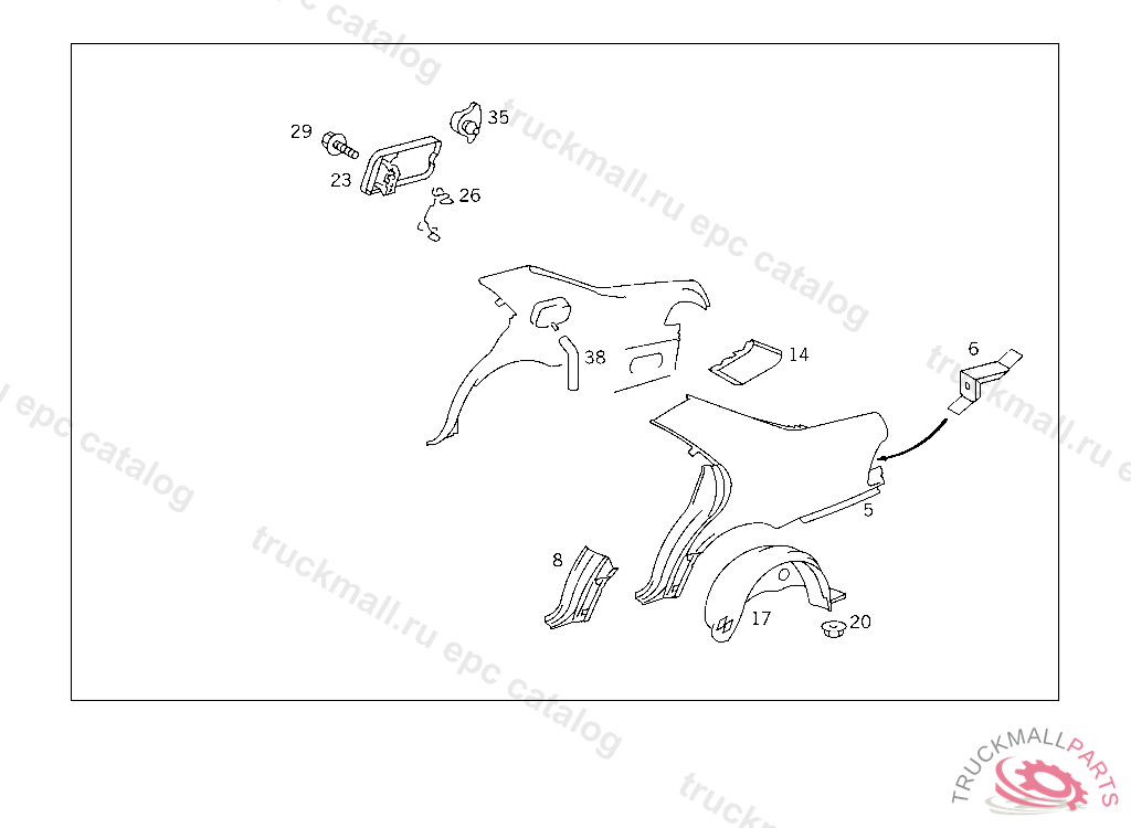 REAR FENDER , ORDER ADDITIONALLY: 1 X 140 682 08 30 ISULATION RIGTH ORDER ADDITIONALLY UP TO IDENT-NO.:A 232041 1 X 140 750 07 06 TANK FLAP 1 X 210 800 04 75 CENTR. LOCKG. MECHANISM ELEMENT 1 X 210 800 00 79 SLEEVE FIRST EXHAUST STOCK OF OLD PARTS UP TO IDENT NO.A 255509, Replaced By: A1406302421
