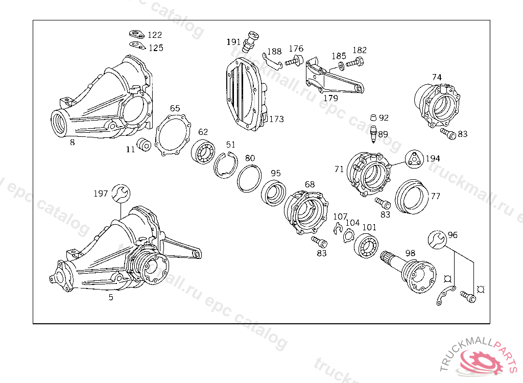 SPACER WASHER AS REQUIRED 2.6 MM, REAR AXLE HOUSING WITH DIFFERENTIAL AND WITH SIDE BEARING CAPS 003 103238 007 087550 086 007105 093 008991 102,103 240182 105 231728 183 015394 190 021956 193 002092 200 027294 280 000776 283 003631