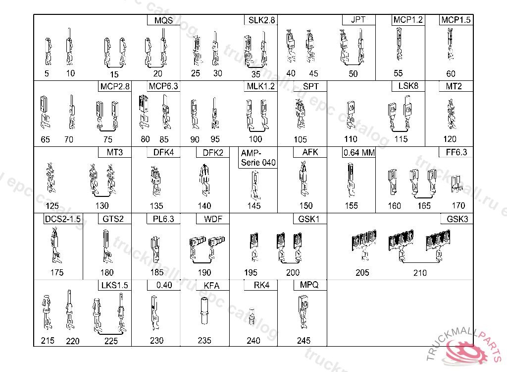 REP.SET CONTACT. CABLE HARNESS REPAIR SOLUTION CONTACTING 0.75 MM2, 203 A 237174 203 F 177685 203 R 028782 210 B 438527 210 X 065665 901-904 R 337627 638 246706 SEE CHASSIS PARTS KIT FOR "FROM VIN" NO. VERBINDER MUESSEN ENTSPRECHEND DEM GESAMT ZU VERBINDENDEN LEITUNGSQUERSCHNITT MITBESTELLT WERDEN. REPARATURANLEITUNG SIEHE WIS LOETENDHUELSEN: A 001 546 99 41GRUEN 0,7 - 2,4 MM2 A 002 546 00 41ROT 2,0 - 4,0 MM2 A 002 546 01 41BLAU3,5 - 8,0 MM2 A 002 546 11 41GELB7,5 - 12,0 MM2 STOSSVERBINDER: A 002 546 13 410,5 MM2 A 002 546 14 410,8 MM2 A 002 546 15 411,3 MM2 A 002 546 16 412,0 MM2