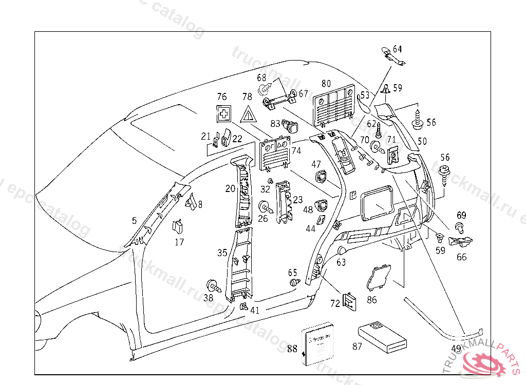 PANELLING B-PILLAR ON THE RIGHT, A 145273 X 707756 EXCEPT CODE 809 ALSO INSTALLED IN VEHICLE TO A 145272, X 707755 WITH CODE 800.......I .......INO.9B96INO.7E33 INO.1A68 INO.9B96 I .......I .......I .......I .......I