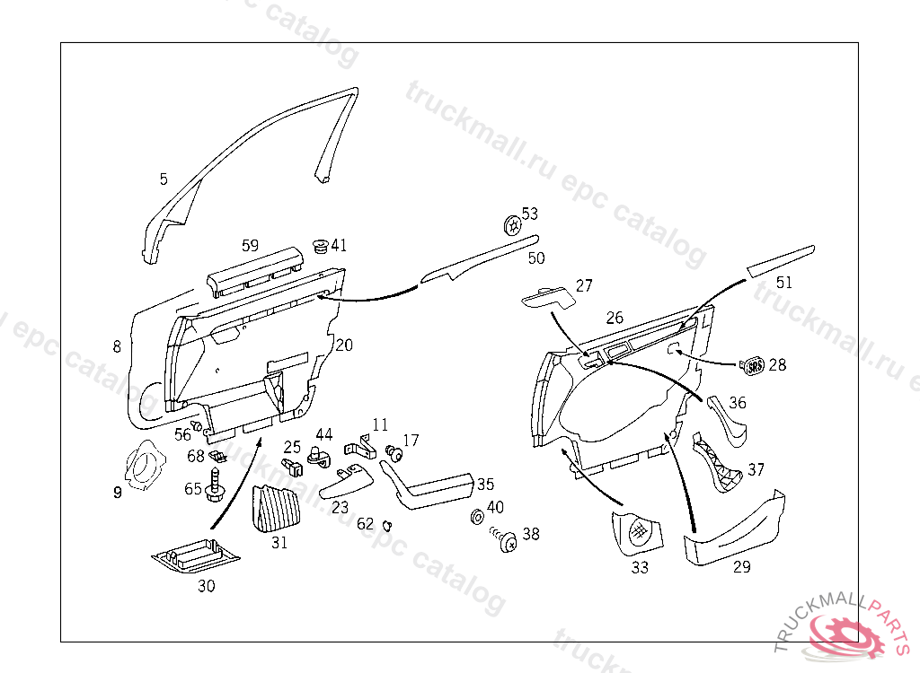 PANELLING RIGHT FRONT DOOR,WITH DOOR POCKET, USED WITH FABRIC TRIM CLASSIC, IN CASE OF VEHICLES LESS COURTESY LAMP, ORDER ADDITIONALLY: 1X 210 727 02 88 A 069024 F 047732 A 344660 F 331440 EXCEPT CODE 806 ALSO INSTALLED IN VEHICLE FROM A 344661, F 331441 WITH CODE 805 NO.9B14 INO.5B31 I....... INO.8G07 I....... INO.7C98 I....... I....... I....... I