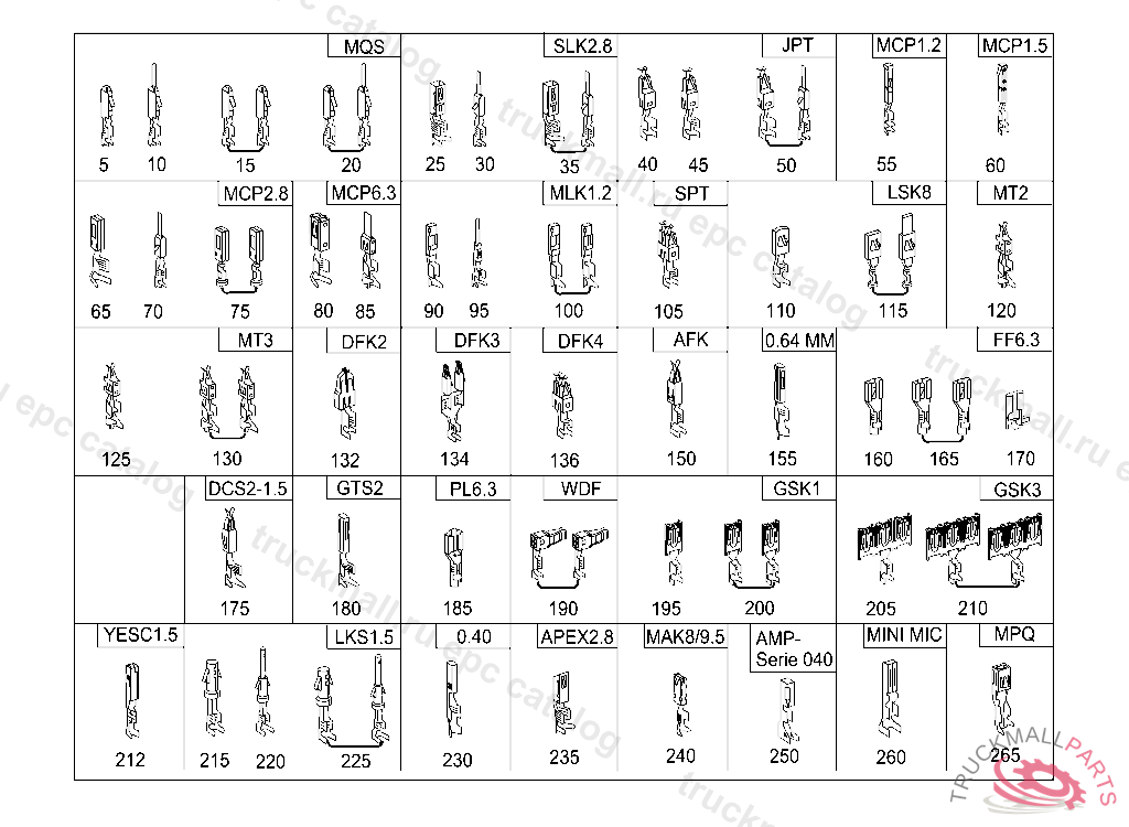 REP.SET CONTACT. CABLE HARNESS REPAIR SOLUTION CONTACTING 0.75 MM2, 203 A 237174 203 F 177685 203 R 028782 210 B 438527 210 X 065665 901-904 R 337627 638 246706 SEE CHASSIS PARTS KIT FOR "FROM VIN" NO. VERBINDER MUESSEN ENTSPRECHEND DEM GESAMT ZU VERBINDENDEN LEITUNGSQUERSCHNITT MITBESTELLT WERDEN. REPARATURANLEITUNG SIEHE WIS LOETENDHUELSEN: A 001 546 99 41GRUEN 0,7 - 2,4 MM2 A 002 546 00 41ROT 2,0 - 4,0 MM2 A 002 546 01 41BLAU3,5 - 8,0 MM2 A 002 546 11 41GELB7,5 - 12,0 MM2 STOSSVERBINDER: A 002 546 13 410,5 MM2 A 002 546 14 410,8 MM2 A 002 546 15 411,3 MM2 A 002 546 16 412,0 MM2