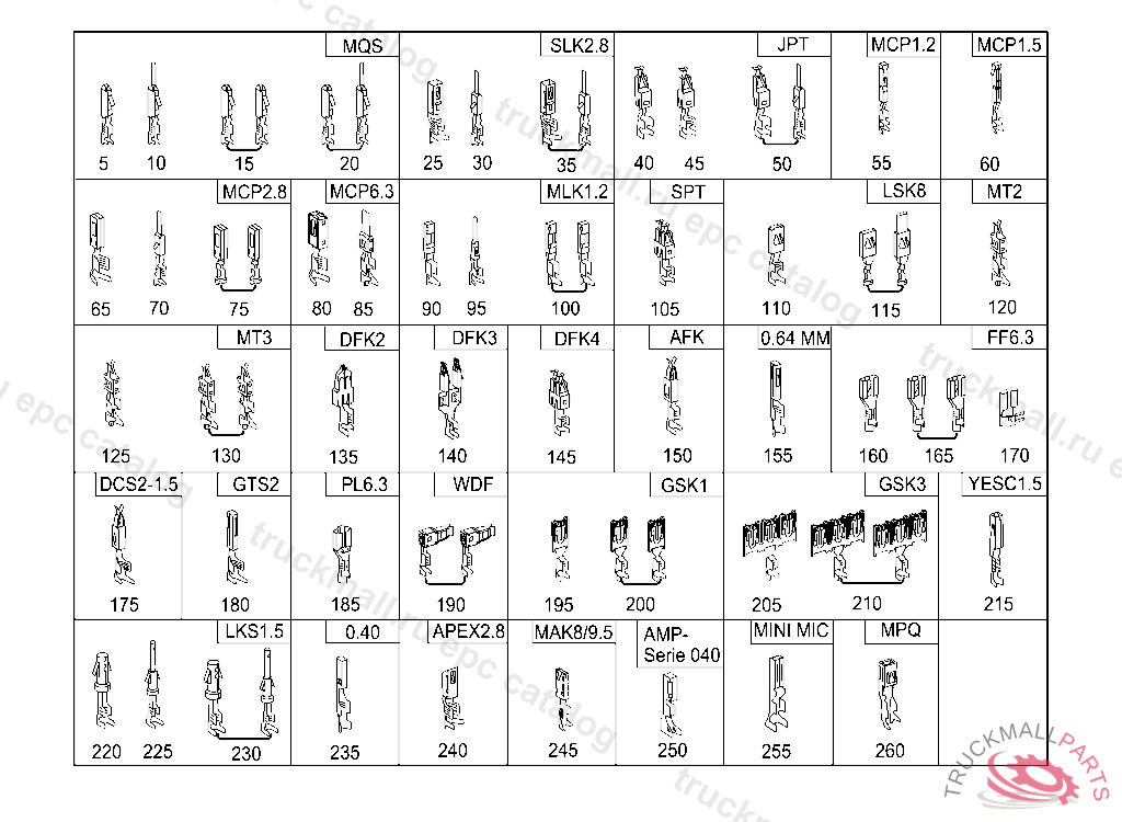 REP.SET CONTACT. CABLE HARNESS REPAIR SOLUTION CONTACTING 0.75 MM2, 203 A 237174 203 F 177685 203 R 028782 210 B 438527 210 X 065665 901-904 R 337627 638 246706 SEE CHASSIS PARTS KIT FOR "FROM VIN" NO. VERBINDER MUESSEN ENTSPRECHEND DEM GESAMT ZU VERBINDENDEN LEITUNGSQUERSCHNITT MITBESTELLT WERDEN. REPARATURANLEITUNG SIEHE WIS LOETENDHUELSEN: A 001 546 99 41GRUEN 0,7 - 2,4 MM2 A 002 546 00 41ROT 2,0 - 4,0 MM2 A 002 546 01 41BLAU3,5 - 8,0 MM2 A 002 546 11 41GELB7,5 - 12,0 MM2 STOSSVERBINDER: A 002 546 13 410,5 MM2 A 002 546 14 410,8 MM2 A 002 546 15 411,3 MM2 A 002 546 16 412,0 MM2