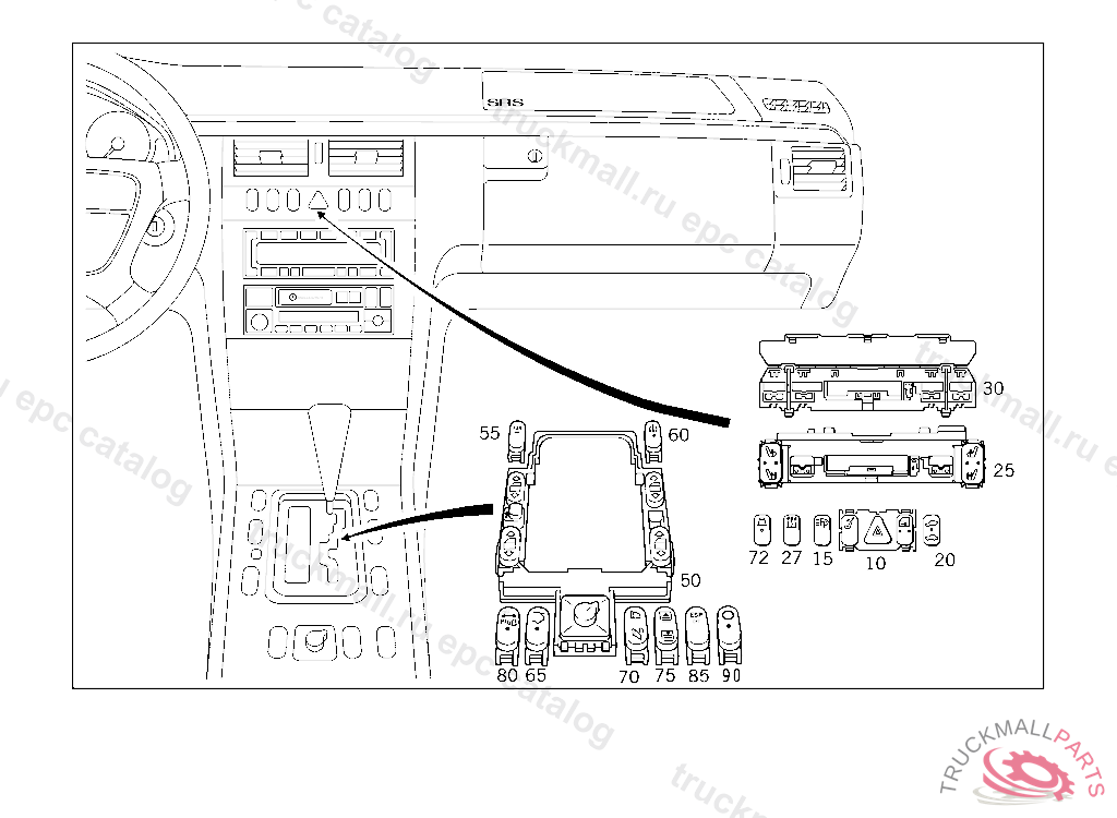 SWITCH HAZ.WARN.FLASH.S.,HD.RESTR.REL.,CENTR. LOCK.S.SWITCH INSIDE VEH., A 394036 X 004166 EXCEPT CODE 807 ALSO INSTALLED IN VEHICLE TO A 394035 / X 004165 WITH CODE 808
