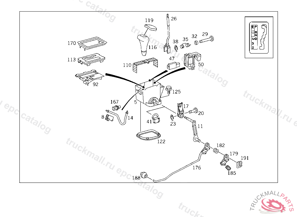26 GEARSHIFT MECHANISM - 090 FLOOR SHIFT USED WITH AUTOMATIC FIVESPEED TRANSMISSION 722.5 IL. 1