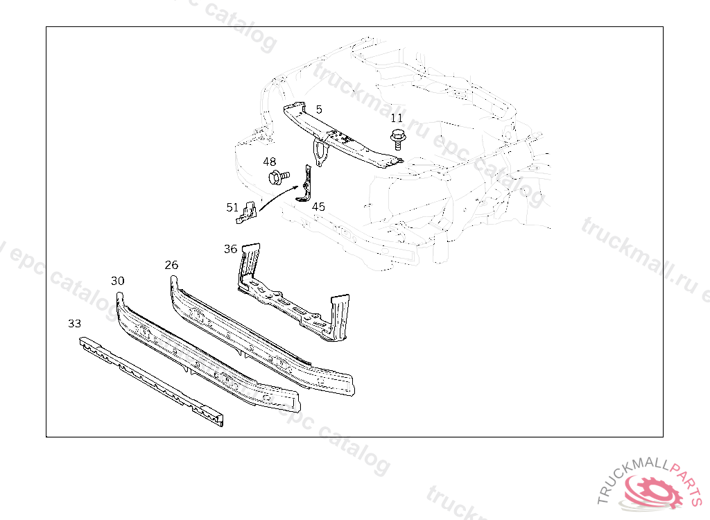 SUPPORT RADIATOR SUPPORT, ORDER ADDITIONALLY FOR USE WITH HIGH-MOUNTED RADIATOR: 1 X 210 620 00 72 FRONT CENTRAL STIFFENING 2 X 210 628 08 31 ADAPTER, RADIATOR MOUNTING, USED WITH HIGH MOUNTED RADIATOR 4 X 201 990 02 50 NUT ORDER ADDITIONALLY FOR USE WITH ELECTRONIC STABILITY PROGRAMM (ESP) CODE 472 1 X 210 620 76 14
