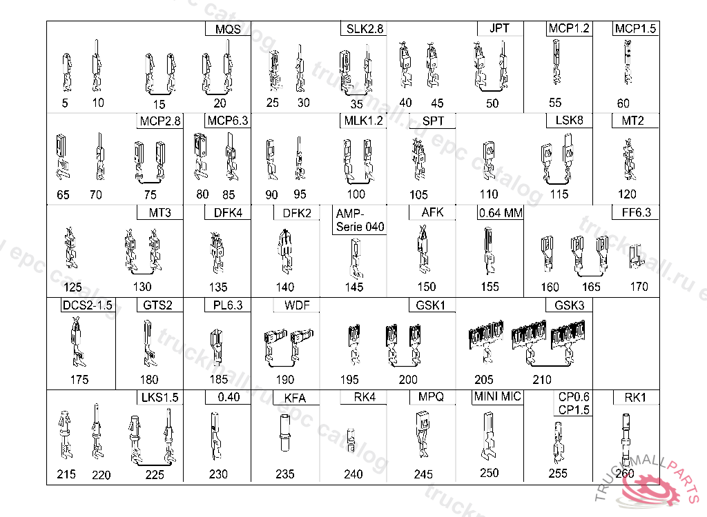 REP.SET CONTACT. CABLE HARNESS REPAIR SOLUTION CONTACTING 0.5 MM2, 203 A 237174 203 F 177685 203 R 028782 210 B 438527 210 X 065665 901-904 R 337627 638 246706 SEE CHASSIS PARTS KIT FOR "FROM VIN" NO. VERBINDER MUESSEN ENTSPRECHEND DEM GESAMT ZU VERBINDENDEN LEITUNGSQUERSCHNITT MITBESTELLT WERDEN. REPARATURANLEITUNG SIEHE WIS LOETENDHUELSEN: A 001 546 99 41GRUEN 0,7 - 2,4 MM2 A 002 546 00 41ROT 2,0 - 4,0 MM2 A 002 546 01 41BLAU3,5 - 8,0 MM2 A 002 546 11 41GELB7,5 - 12,0 MM2 STOSSVERBINDER: A 002 546 13 410,5 MM2 A 002 546 14 410,8 MM2 A 002 546 15 411,3 MM2 A 002 546 16 412,0 MM2