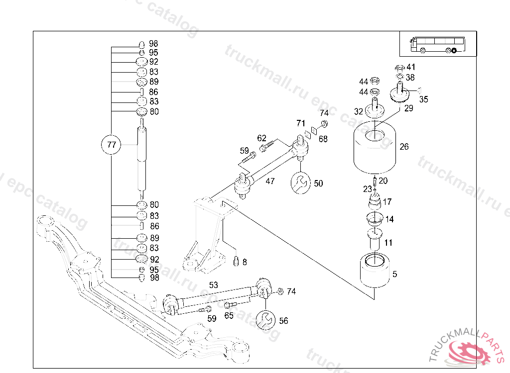 RADIUS ROD (LONGITUDINAL CONTROL ARMS) TOP, ON VEHICLES HAVING NO MERCEDES BENZ BODY FROM IDENT NO. 097836 , 628.000.10.300182, 628.000.14.172141 FOR USE WITH MERCEDES-BENZ BODY FROM IDENT NO. 097976 ALSO INSTALLED ON 300175-300180.