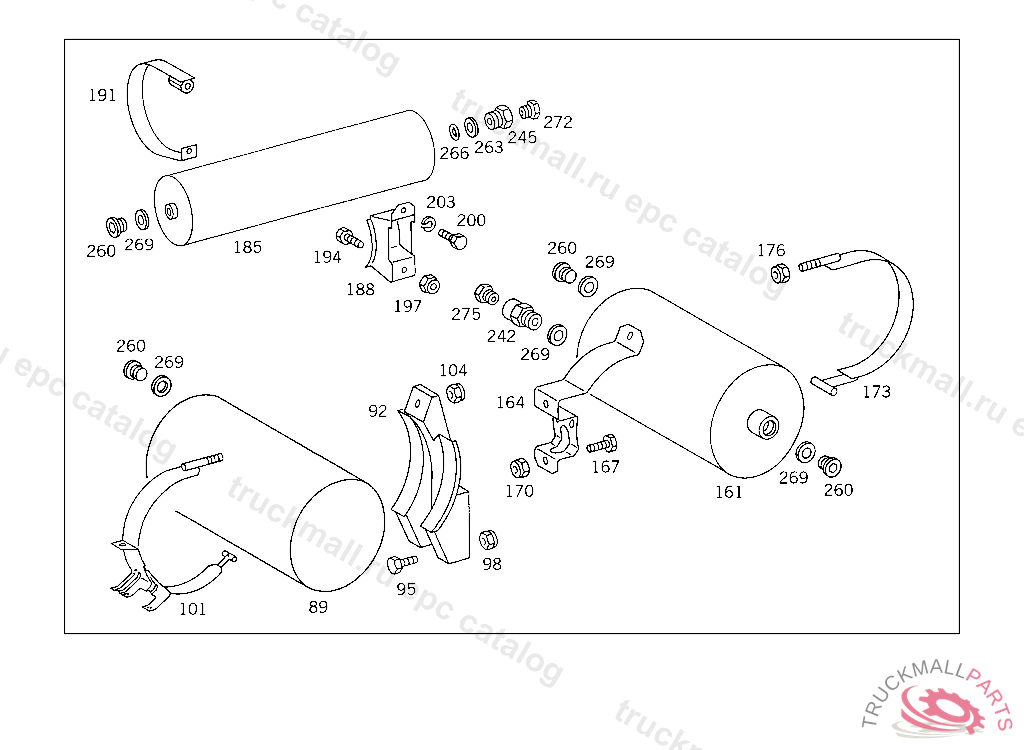 COMPRESSED AIR RESERVOIR. RESERVOIR6 L, TO VOSS 232, FOR VEHICLES WITH VOSS 230 CONNECTOR:ADD. MOUNT FITTING "A 004 997 82 72" WITH O-RING "A 000 987 04 46" AND THRUST RING "A 000 997 02 03" TO AIR RESERVOIR