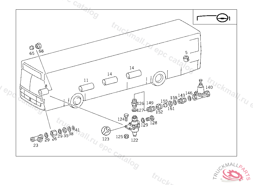 OUTLET OVERFLOW VALVE TO BRACKET, UP TO IDENT NO. 059862 USED WITH MERCEDES-BENZ BODY 357.0 UP TO IDENT NO. 060198 USED WITHOUT MERCEDES-BENZ BODY 357.0 EXCEPT FOR 059279