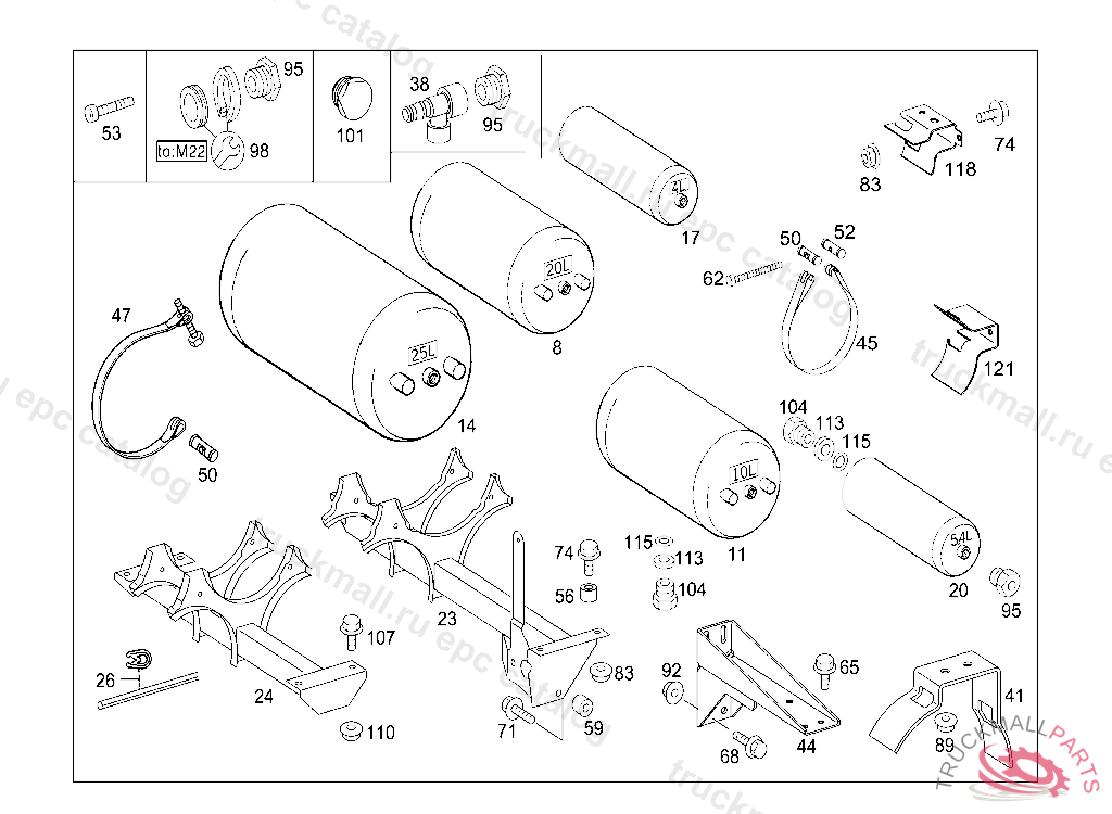 RESERVOIR STEEL 5.4L, D144MM, VOSS 232, FOR VEHICLES WITH VOSS 230 CONNECTOR: ADD. MOUNT FITTING "A 004 997 82 72" WITH O-RING "A 000 987 04 46" AND THRUST RING "A 000 997 02 03" TO AIR RESERVOIR