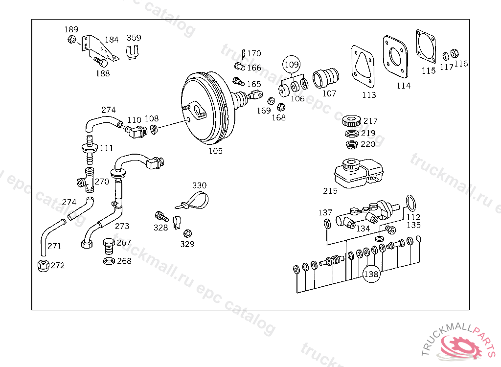 BRAKE BOOSTER ASSEMBLY , FROM CHASSIS 018154 ALSO INSTALLED ON 017661,017829 EXCEPT FOR 018155,018156,018159,018308,018310,018315,018317,018318,018327,018350,018355. EXHAUST STOCK OF OLD PARTS NUMBER FIRST UP TO CHASSIS 533350, Replaced By: A0024305630, +001A1262920074, +001N912011008000