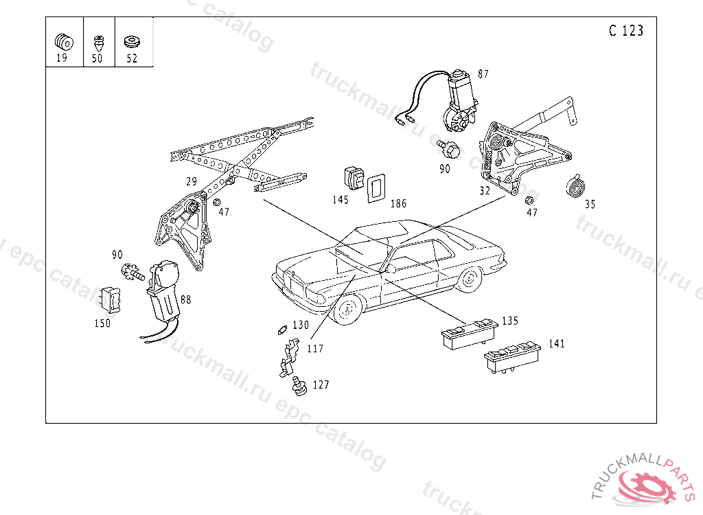 WINDOW REGULATOR RANGE OF DELIVERY FOR SUBSEQUENT INSTALLATION, THE FOLLOWING PARTS ARE NOT INCLUDED IN RANGE OF DELIVERY: DOOR COVERING, BOTTOM COVERING IN HOUSING, ESCUTCHEON USED FOR SWITSCH ON REAR DOOR COVERING