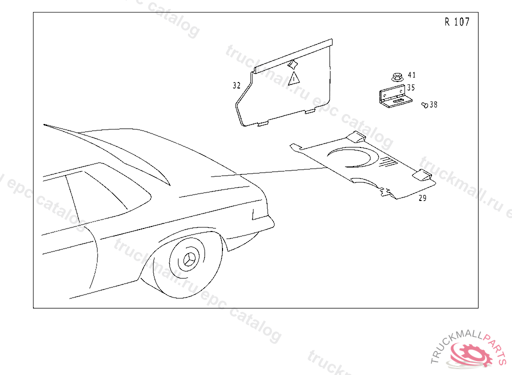 LINING LUGGAGE COMPARTMENT, VELOURS, 107.024 019202 ALSO INSTALLED ON 019191-019193 107.044 042525 EXCEPT FOR 042532,042538,042560 UP TO CHASSIS NEW EQUIPMENT 9/79 107.022 007532 EXCEPT FOR 007464,007504,007521-007523,007525,007527,007529,007531. 107.023 013659 EXCEPT FOR 013407,013603,013654,013656-013658. 107.042 006720 EXCEPT FOR 006341,006410,006449,006450,006710-006719. 107.043 014796 EXCEPT FOR 014472,014717 107.044 058394 EXCEPT FOR 057628,057973,057975,058211,058260,058280,058284,058289,058296,058297,058305,058324-058348,058350- 058369,058371-058392. NO.7088 INO.5061 INO.8288 INO.8289 INO.8290 INO.6076 INO.3066 I I