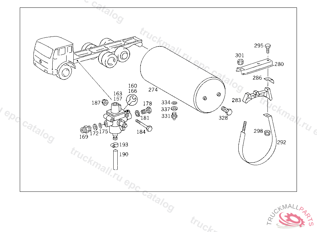 RESERVOIR COMPRESSED AIR 20 L, TO VOSS 232, FOR VEHICLES WITH VOSS 230 CONNECTOR: ADD. MOUNT FITTING "A 004 997 82 72" WITH O-RING "A 000 987 04 46" AND THRUST RING "A 000 997 02 03" TO AIR RESERVOIR