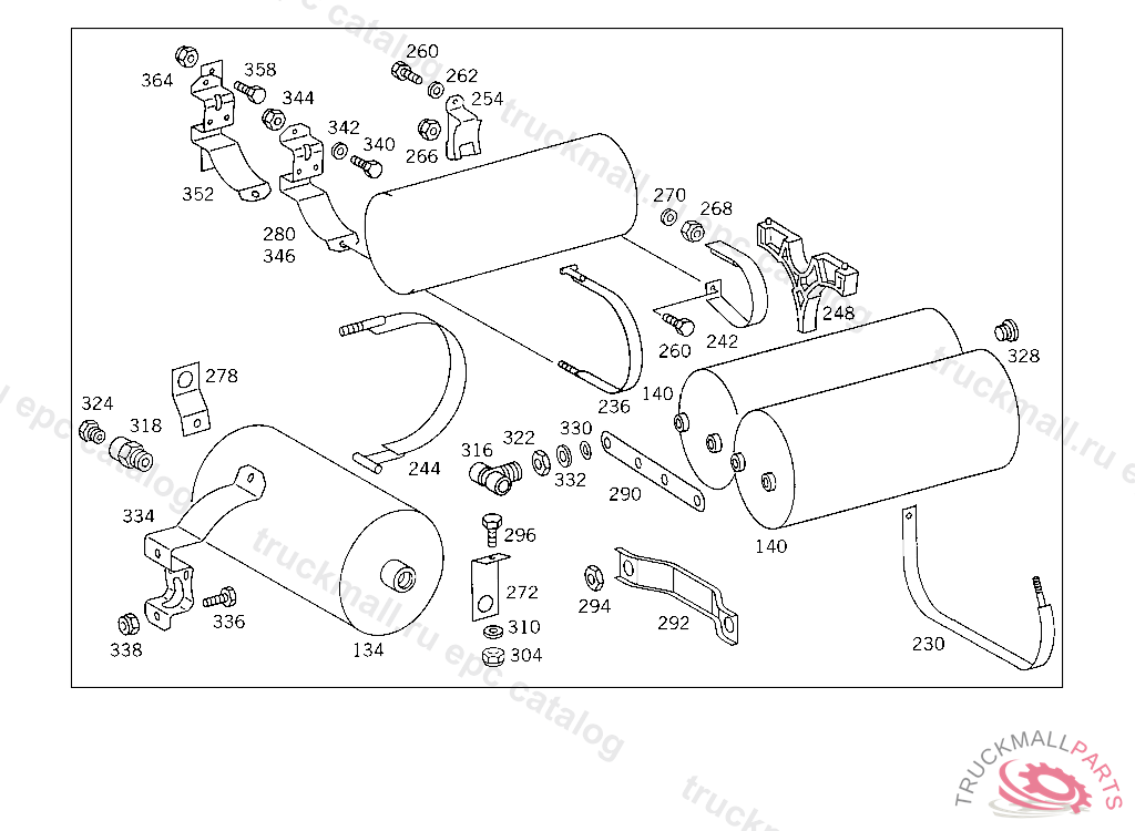 COMPRESSED AIR RESERVOIR. RESERVOIR6 L, TO VOSS 232, FOR VEHICLES WITH VOSS 230 CONNECTOR:ADD. MOUNT FITTING "A 004 997 82 72" WITH O-RING "A 000 987 04 46" AND THRUST RING "A 000 997 02 03" TO AIR RESERVOIR