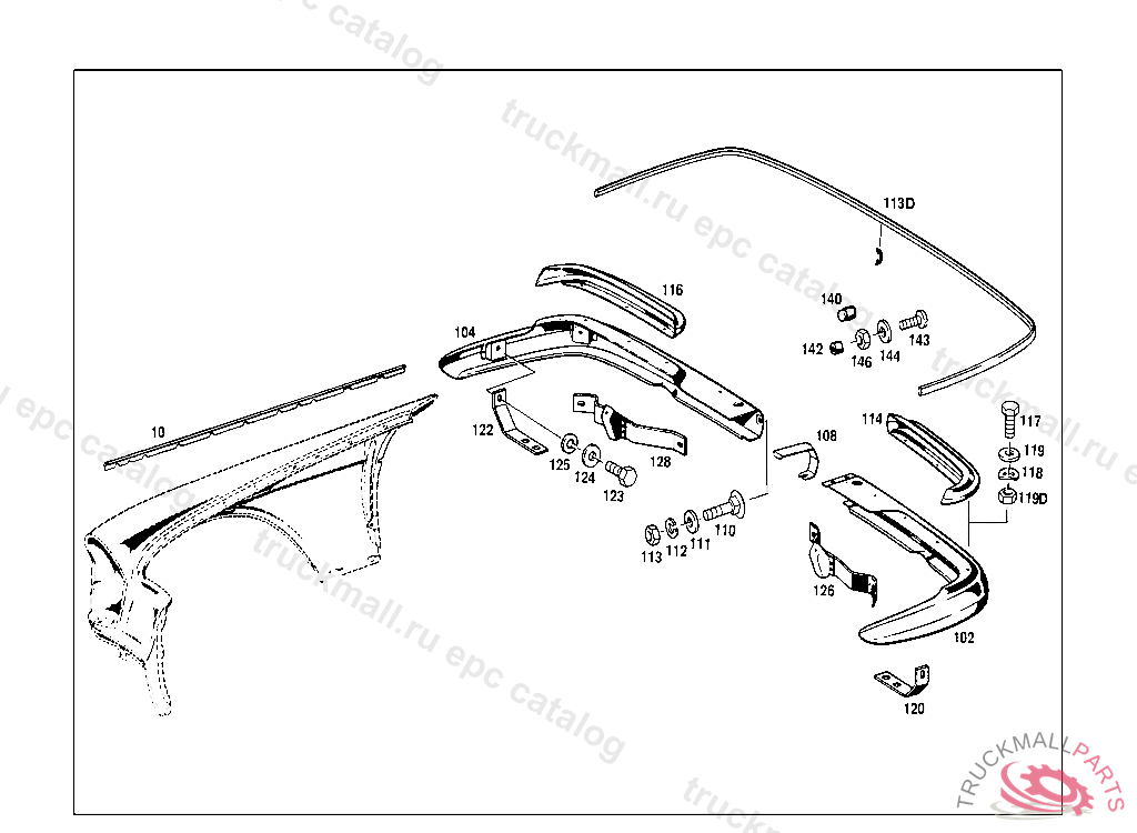 REAR BUMPER FACE BAR REAR RIGHT, UP TO CHASSIS: 111.024,025 003544, EXCEPT FOR 003479,003498,003515-003519,003521,003522,003524-003530,003532-003534,003536-003543. 111.021,023 UNTIL PRODUCTION STOP 112.021,023 UNTIL PRODUCTION STOP