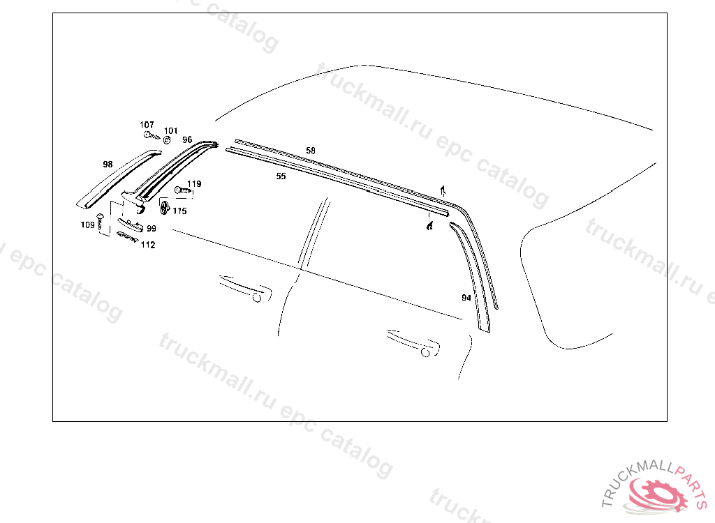 DRIP MOULDING RIGHT, FROM CHASSIS: 015 200001 110 400001 115 200001 005,017,105,107,108,117,119 000001