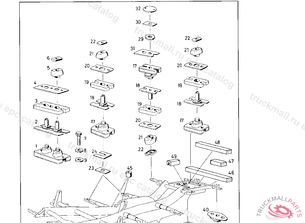 AUFBAUBEFESTIGUNGSLAGER AN QUERTRAGER MITTE U. HINTEN, AN TRAGER FUR HINTERFEDER UND AN TRAGSCHIENE FUR KRAFTSTOFFBEHALTER