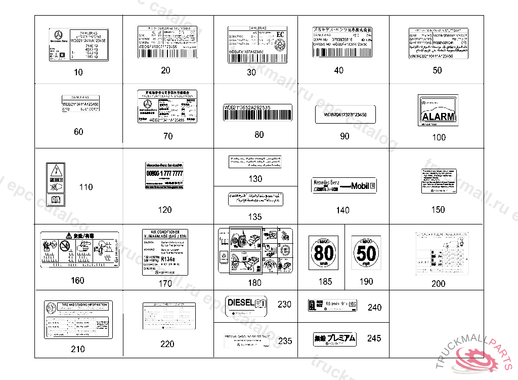INFORMATION LABEL SUPPLEMENTARY SPECIFICATION, TIRE INFLATION PRESSURE, FIRST EXHAUST STOCK OF OLD PARTS UP TO IDENT NO. G 17611320130628, Replaced By: A2045843000
