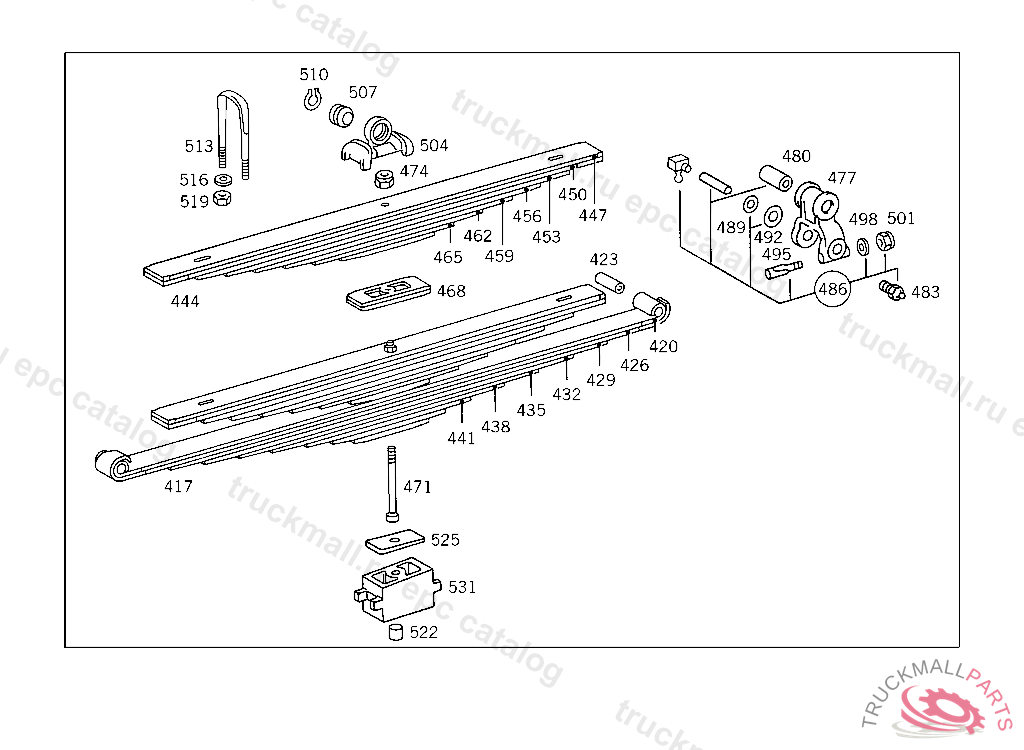 REAR SPRING 6-LEAF,WITH 5-LEAF HELPER SPRING, MODEL 383.1,DELIVER ADDITIONALLY: 1X SPRING BOLT 004626 012156 UP TO CHASSIS 4 889187, SEE SERVICE INFORMATION 32/8