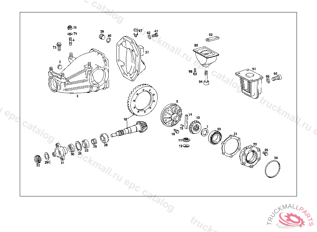 REPAIR KIT REAR AXLE HOUSING WITH DIFFERENTIAL, REAR AXLE HOUSING WITH DIFFERENTIAL AND WITH SIDE BEARING CAPS 003 103238 007 087550 086 007105 093 008991 102,103 240182 105 231728 183 015394 190 021956 193 002092 200 027294 280 000776 283 003631