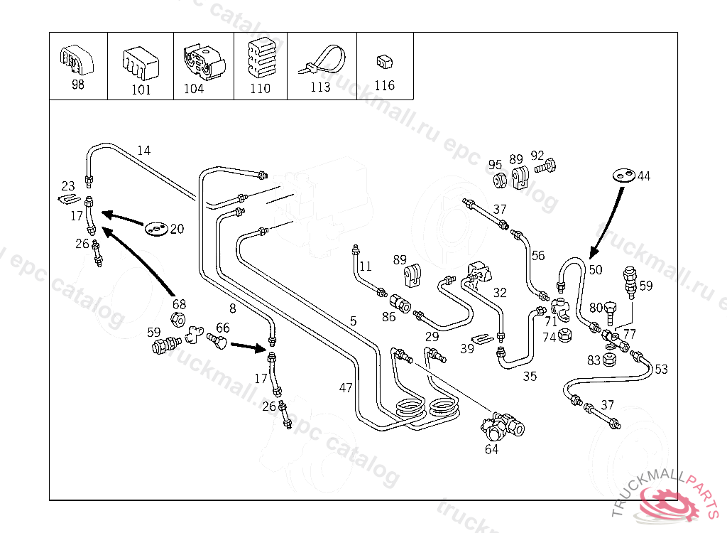 LINE FROM MASTER CYLINDER TO ADAPTER FITTING, 000 193701 003 097469 086 006508 093 007717 102,103 209243 183 013349 190 020074 193 000014 200 006559 283 001514 INAPPLICABLE TO ANTI-LOCK BRAKING SYSTEM (ABS)