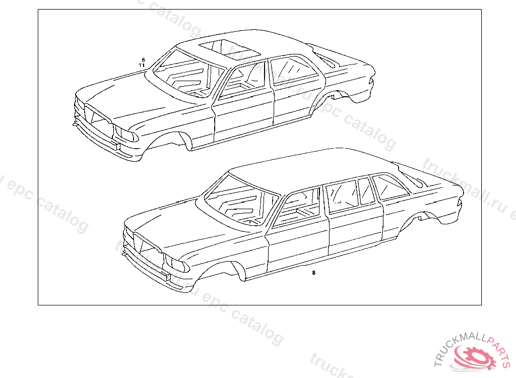 BODY SHELL WITH SLIDING ROOF, WHEN ORDERING, QUOTE IN ADDITION TO CHASSIS NO.: WITH, OR LESS, SLIDING ROOF, STEERING COLUMN SHIFT, OR FLOOR SHIFT, WHEN PLACING ORDERS FOR STOCK,INDICATE CHASSIS MODEL, ATTENTIONUTHE BODY SHELL SUPPLIED CORRESPONDS TO THE NEWEST STATE OF PRODUCTION, THEREFORE,FOR ASSEMBLY AND FOR INTERIOR APPOINTMENTS OF THE NEW BODY SHELL ALWAYS ORDER THE NEWEST SPARE PARTS ORDER ADDITIONALLY UP TO IDENT NO. 020,023 PRODUCTION STOP 026 112665 030 PRODUCTION STOP 120 320116 123 338068 126 PRODUCTION STOP 130 208108 220 092448 223 105768 2X 000 990 51 33 ORDER ADDITIONALLY UP TO IDENT NO. 023 194299 026,028 099458 030 031037 033 082985 120 238027 123,125 219667 130,132 219919 220 007082 223 013533 1X 123 620 01 85 1X 123 885 30 23