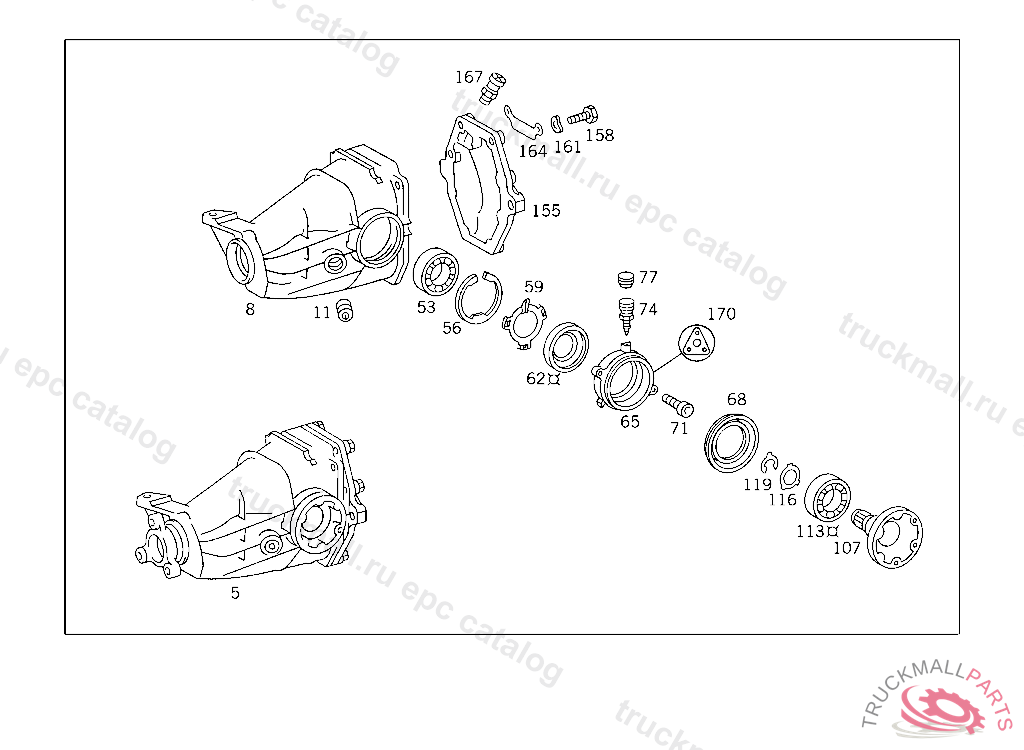 HOUSING REAR AXLE HOUSING WITH DIFFERENTIAL ASD 1:3,46, FLANSCHDURCHMESSER 90MM, A 887156 EXCEPT FOR A 887200,A 887207,A 887293,A 887411,A 887517,A 887935. F 093373 PLEASE MIND MODIFIED ARRANGEMENT OF LINES PART IS ONLY OR ALSO SUPPLIED AS RECONDITIONED PART