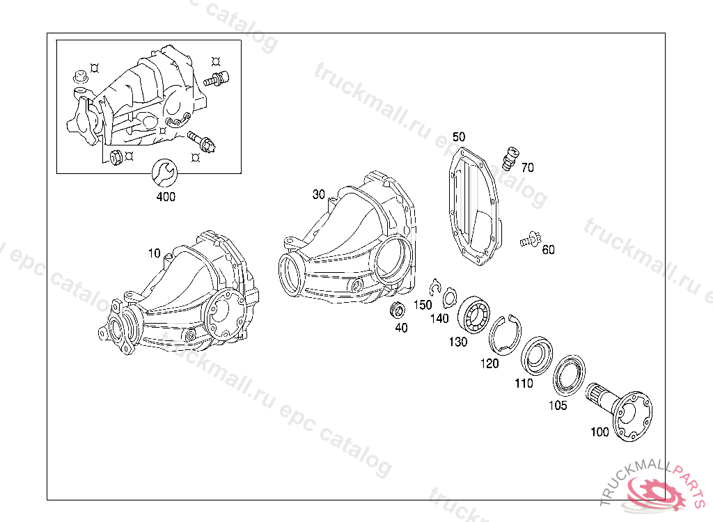 HOUSING REAR AXLE CENTER ASSEMBLY WITH FLANGE 1:2.65, B 26635020010930 B 50188520011030 PART IS ONLY OR ALSO SUPPLIED AS RECONDITIONED PART IMPORTANT: FROM IDENT B 324700, X 067301 TO IDENT B 501886, X 079467 MIXED INST. POSS. NOTE REMOVED AXLE SHAFT, NOT VALID WITH INSERTED AXLE SHAFT