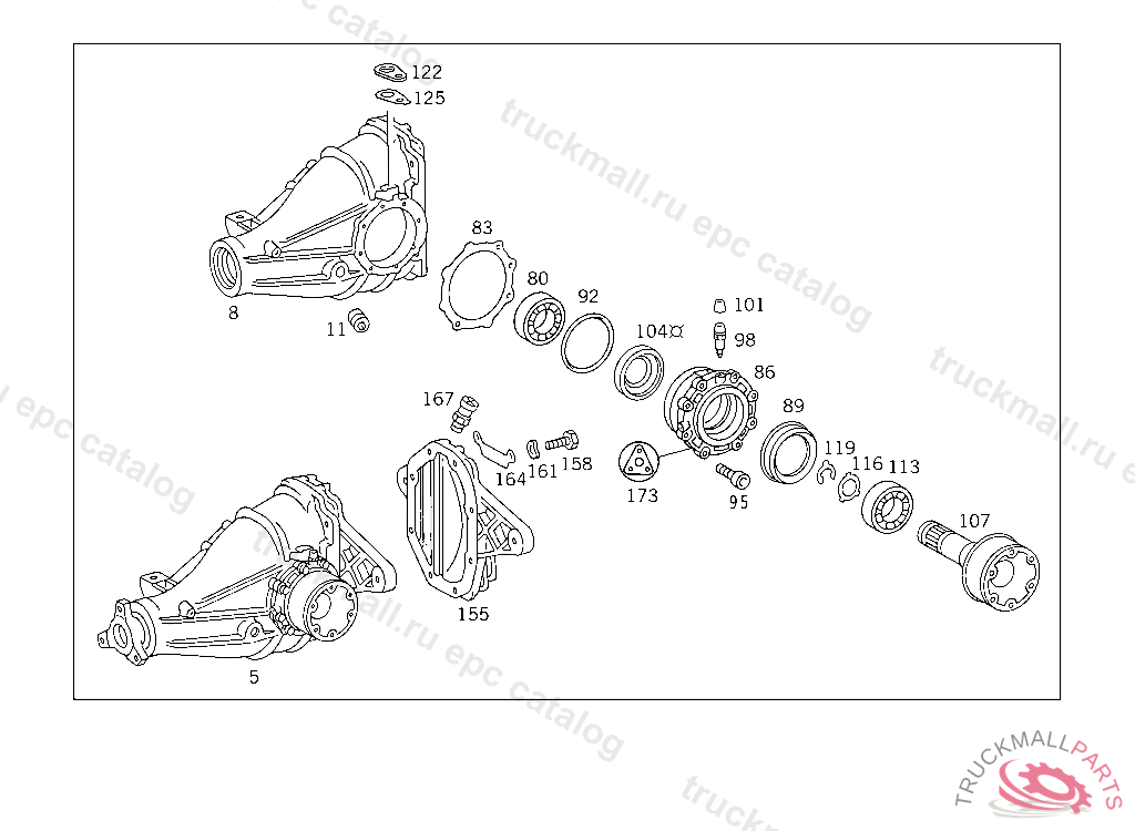SPACER WASHER AS REQUIRED 2.6 MM, REAR AXLE HOUSING WITH DIFFERENTIAL AND WITH SIDE BEARING CAPS 003 103238 007 087550 086 007105 093 008991 102,103 240182 105 231728 183 015394 190 021956 193 002092 200 027294 280 000776 283 003631
