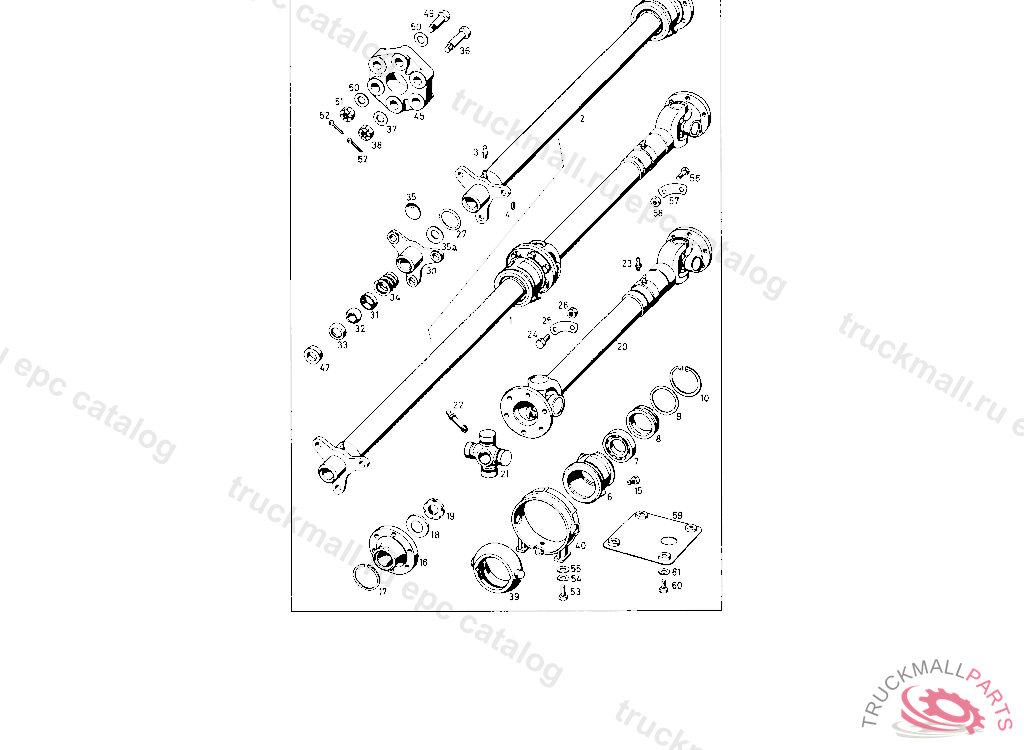 PARTED PROPELLER SHAFT WITH INTERM. BEARING, WITHOUT MOUNTING SUPPORT, RUBBER BEARING AND CENTERING FLANGE
