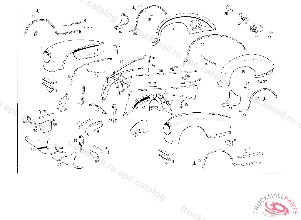 SIDE PART, RIGHT FOR COWL BETWEEN FRONT MUDGUARD AND ENGINE HOOD WITH MOUNTING HOLES FOR ORNAMENTAL RAIL FROM CHASSIS NO. 65 00108