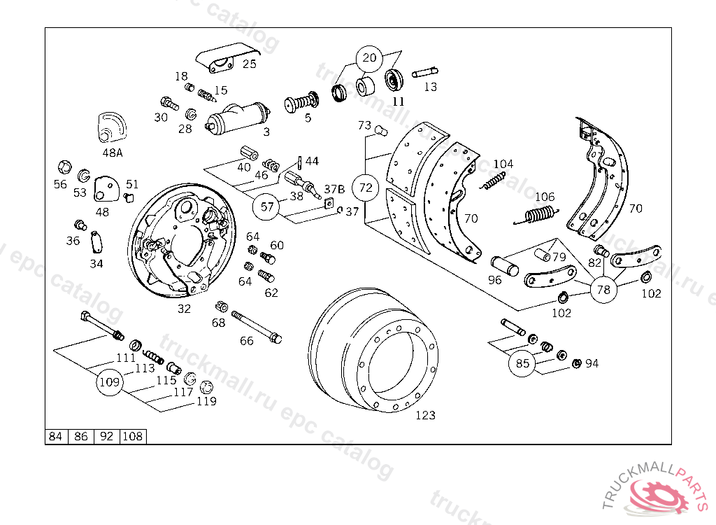 SCREW FRONT WHEEL BRAKE TO STEERING KNUCKLE, 10/20 FROM CHASSIS 796991, 50/60 FROM CHASSIS 790759 ALSO INSTALLED ON 500001-599999 UP TO CHASSIS 910369 ALSO INSTALLED ON 500001-501455,FROM CHASSIS 910370 AND 501456-599999 SEE SPARE PARTS LIST 103