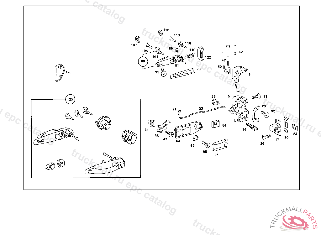 OUTFIT (LOCK,KEY,HANDLE) DOOR POCKET & GLOVE COMPTMT. LOCKABLE, USED WITH CENTRAL LOCKING MECHANISM, 003 108194 007 095971 086 007385 093 010189 102,103 282248 105 257003 183 018166 190 023811 193 005892 200 064147 280 002523 283 007422