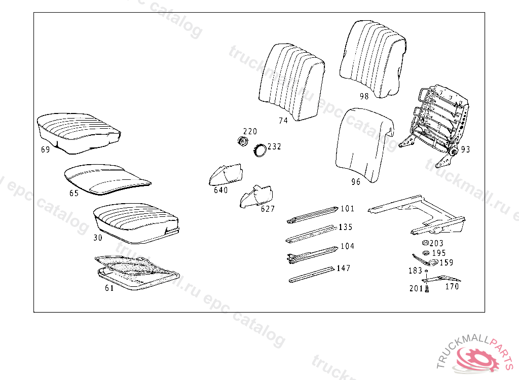 SEAT CUSHION , BLACK NO.9007 CODE 261, BLUE NO.5020 CODE 262 MAHOGANY NO.8100 CODE 263, BEIGE NO.8103 CODE 264, PARCHMENT NO.8115 CODE 265, OLIVE GREEN NO.6028 CODE 266 BAMBOO NO.8102 CODE 267, RED NO.3030 CODE 268 FROM CHASSIS 116.020 112847 116.024,025 132678 116.028,029 050610 116.032,033 088837 116.036 005559