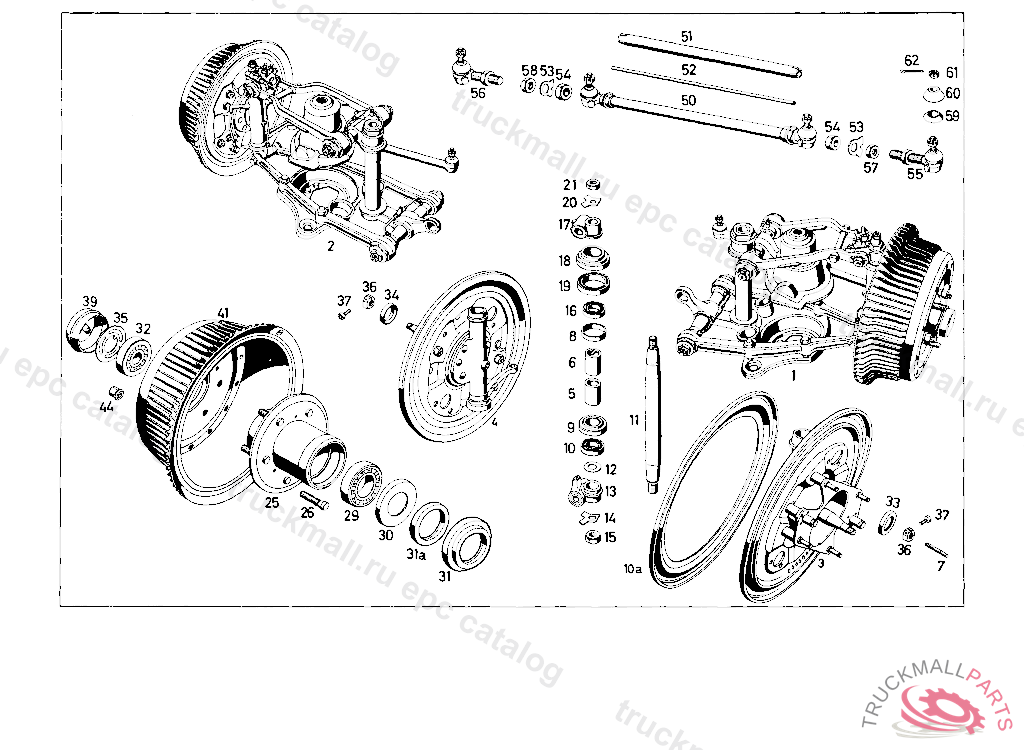 FRONT AXLE, LEFT WITH WISHBONE, BRAKE 90 MM WIDE LOWER SPRING RETAINERS, A1-FIN BRAKE DRUM AND TIE ROD WITHOUT FRONT SPRING FROM FRONT AX, IN CASE OF RIGHT-HAND DRIVE TURN 1 TIE ROD HEAD TO DEG. 180 AND ADJUST TO APPLICABLE LENGTH