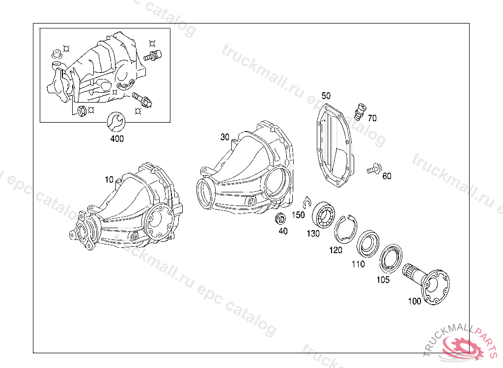 HOUSING REAR AXLE CENTER ASSEMBLY WITH FLANGE 1:2.65, B 26635020010930 B 50188520011030 PART IS ONLY OR ALSO SUPPLIED AS RECONDITIONED PART IMPORTANT: FROM IDENT B 324700, X 067301 TO IDENT B 501886, X 079467 MIXED INST. POSS. NOTE REMOVED AXLE SHAFT, NOT VALID WITH INSERTED AXLE SHAFT