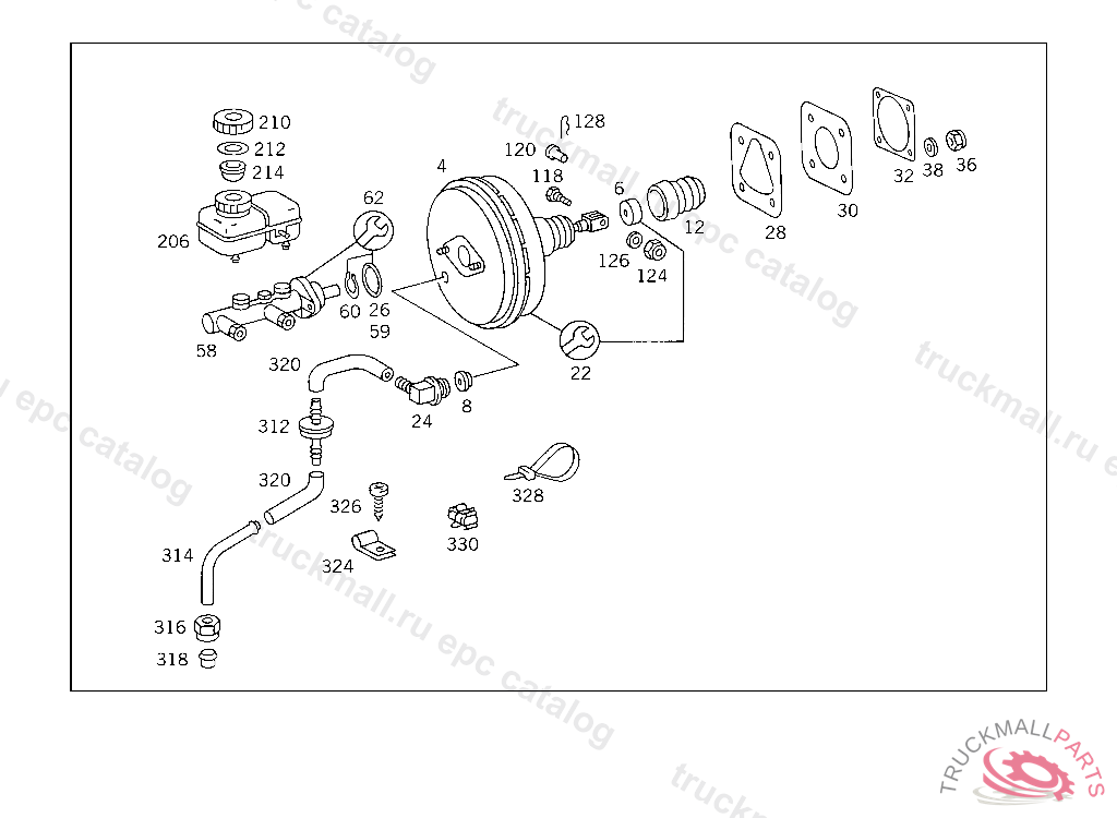 BRAKE BOOSTER ASSEMBLY , FROM CHASSIS 018154 ALSO INSTALLED ON 017661,017829 EXCEPT FOR 018155,018156,018159,018308,018310,018315,018317,018318,018327,018350,018355. EXHAUST STOCK OF OLD PARTS NUMBER FIRST UP TO CHASSIS 533350, Replaced By: A0024305630, +001A1262920074, +001N912011008000