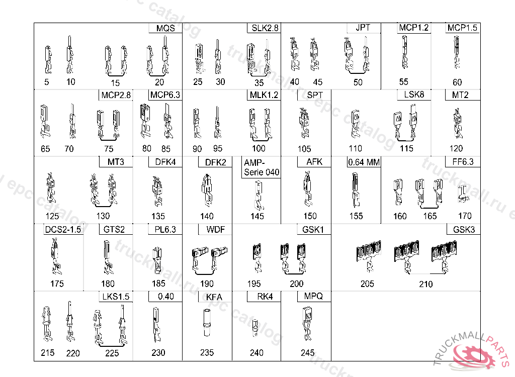 REP.SET CONTACT. CABLE HARNESS REPAIR SOLUTION CONTACTING 0.5 MM2, 203 A 237174 203 F 177685 203 R 028782 210 B 438527 210 X 065665 901-904 R 337627 638 246706 SEE CHASSIS PARTS KIT FOR "FROM VIN" NO. VERBINDER MUESSEN ENTSPRECHEND DEM GESAMT ZU VERBINDENDEN LEITUNGSQUERSCHNITT MITBESTELLT WERDEN. REPARATURANLEITUNG SIEHE WIS LOETENDHUELSEN: A 001 546 99 41GRUEN 0,7 - 2,4 MM2 A 002 546 00 41ROT 2,0 - 4,0 MM2 A 002 546 01 41BLAU3,5 - 8,0 MM2 A 002 546 11 41GELB7,5 - 12,0 MM2 STOSSVERBINDER: A 002 546 13 410,5 MM2 A 002 546 14 410,8 MM2 A 002 546 15 411,3 MM2 A 002 546 16 412,0 MM2